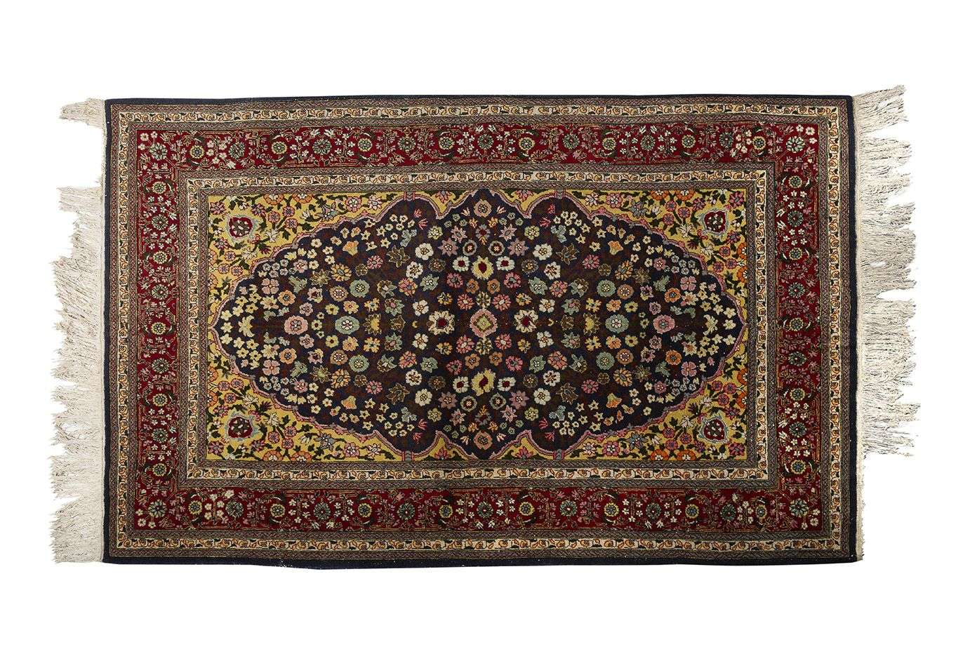 Velours de laine soyeuse de qualité sur fondations en coton. Champ bleu nuit à décor de mille fleurs polychromes en forme de diamants éclatés. Quatre écoinçons jaune d'or. Bordure principale rubis à décor rappelant le champ central. Belle polychromie.