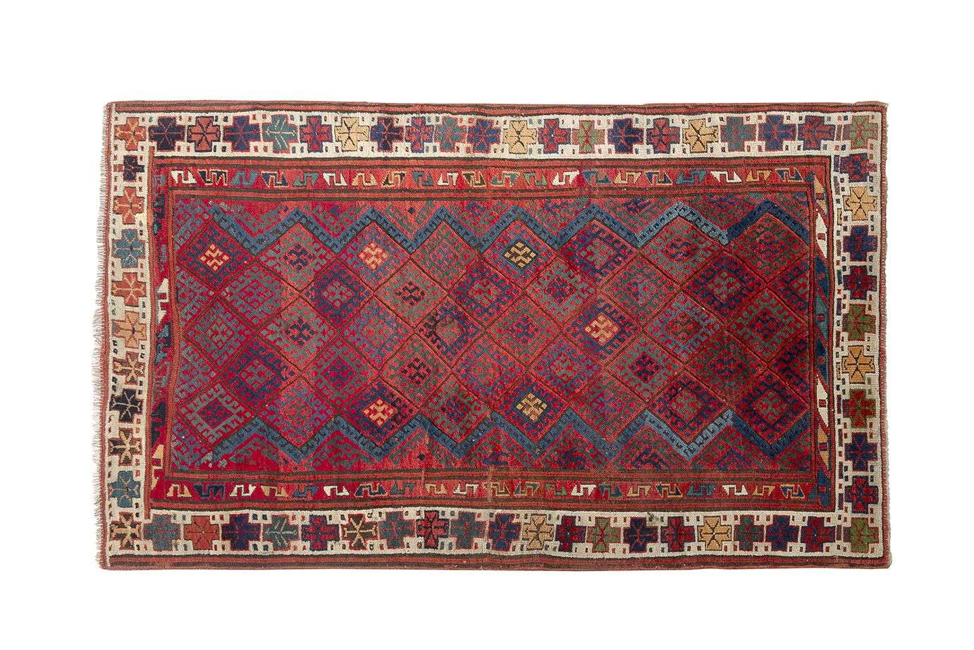 Velours de laine sur fondations en laine. À décor de semis de caissons losangiques incrustés de crabes et tarentules stylisées géométriquement en polychromie. Belle polychromie.