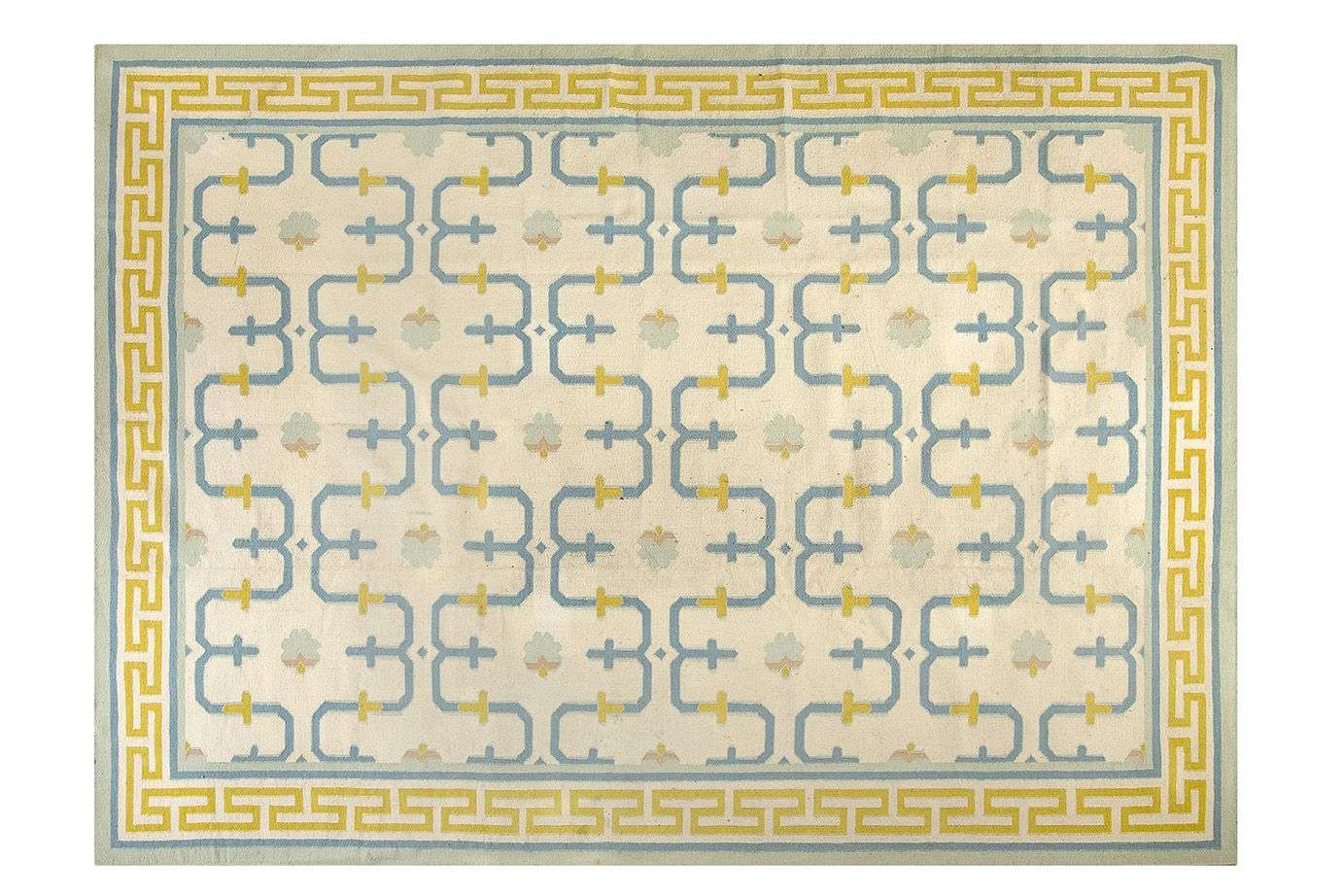 Tissé en laine sur fondations en coton. Champ ivoire à décor de labyrinthes stylisés gris bleuté. Bordure à la grecque.