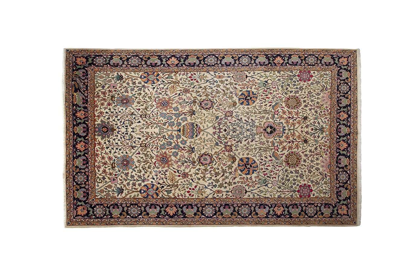 Velours de laine soyeuse d'agneau de qualité sur fondations en coton. Décor et graphisme se rapprochant des tapis d'époque de la dynastie des Safavides de la fin du XVIe et du XVIIe siècle sous Shah Abbas (le Louis XIV Persan). Champ beige à original décor de mosaïque de palmettes et bulbes de fleurs stylisés géométriquement en polychromie, finement dessinés entourés de fines tiges et fins branchages formant des plantes et des brins floraux multicolores. Cinq bordures dont la principale bleu nuit a décor rappelant le champ central. Remarquable finesse. Beau graphisme.