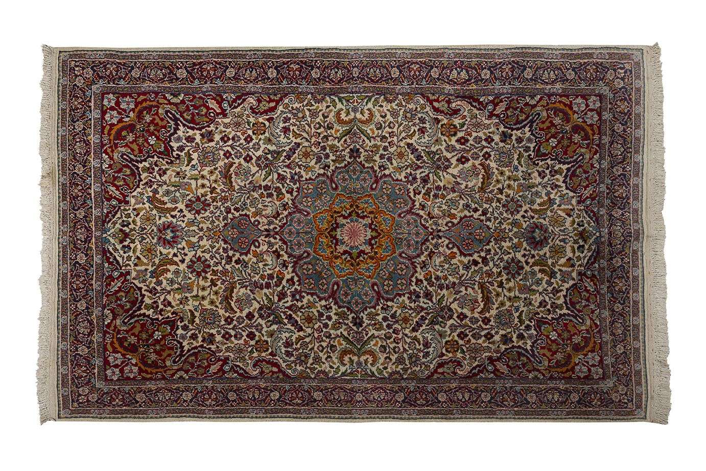Velours de laine soyeuse d'agneau sur fondations en coton. Champ ivoire à décor floral polychrome. Belle finesse.
