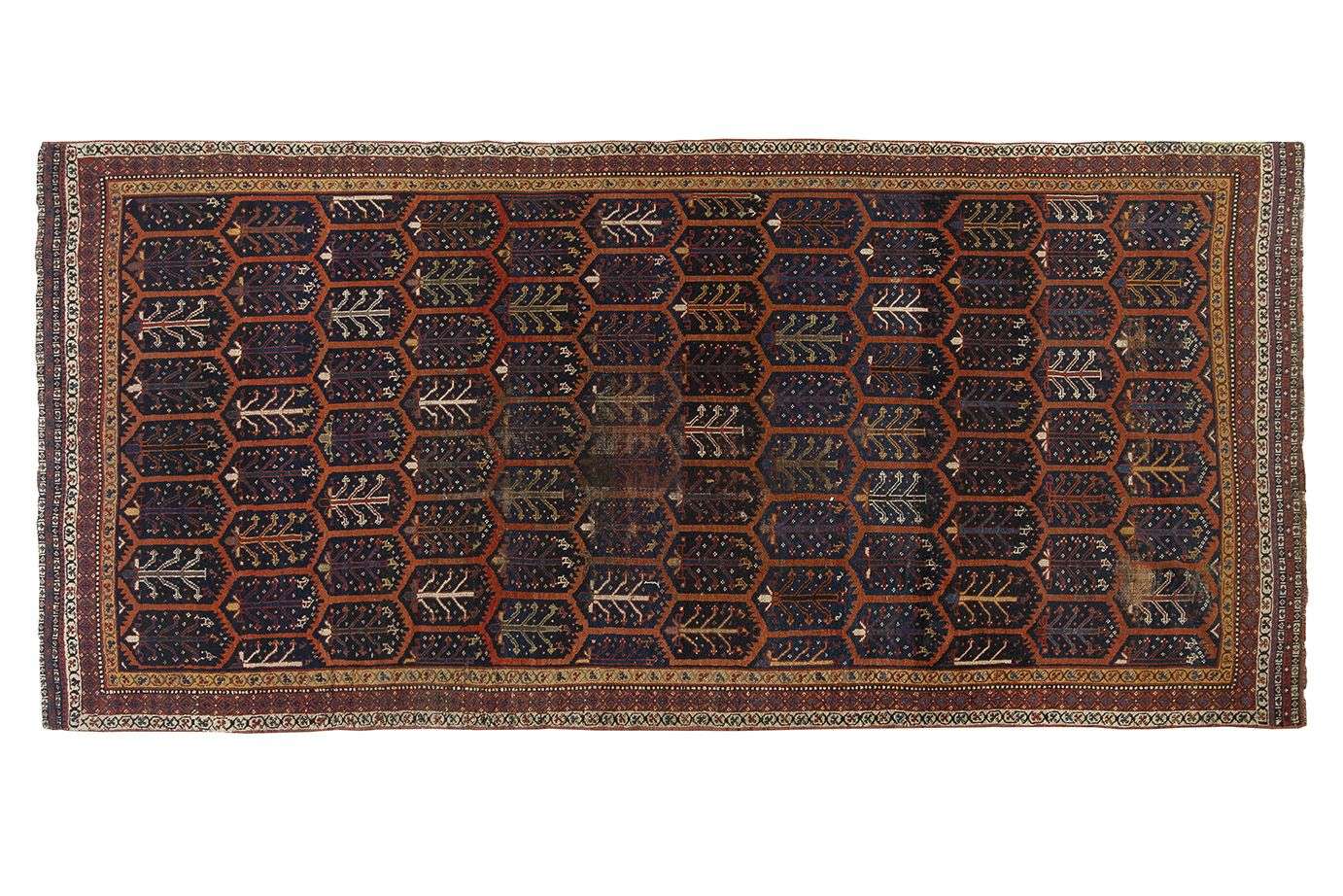Velours de laine sur fondations en laine. Champ bleu nuit à décor de caissons incrustés d'arbres de vie stylisés géométriquement en polychromie.