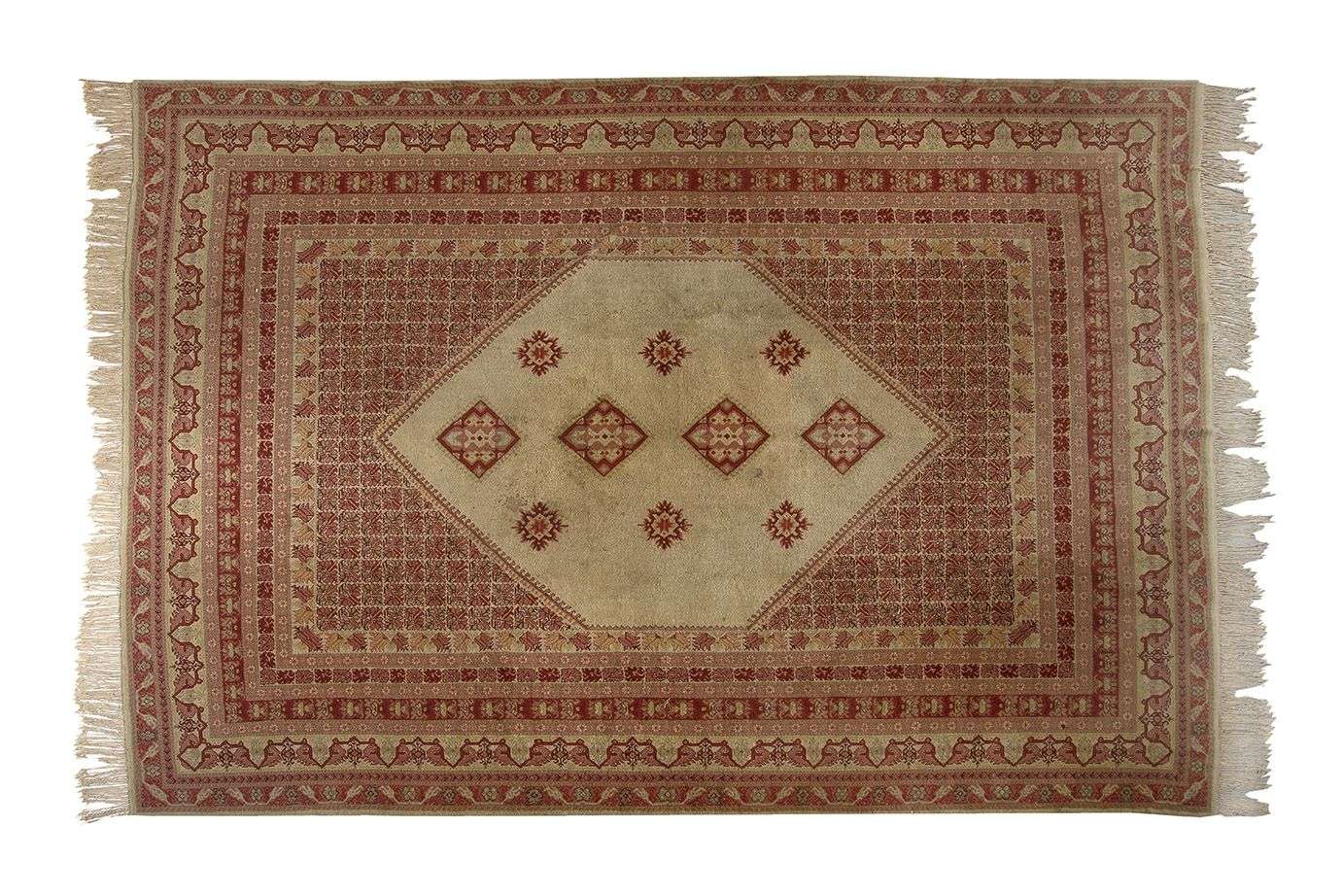 Velours de laine sur fondations en coton. Champ beige safrané à large médaillon central géométrique.