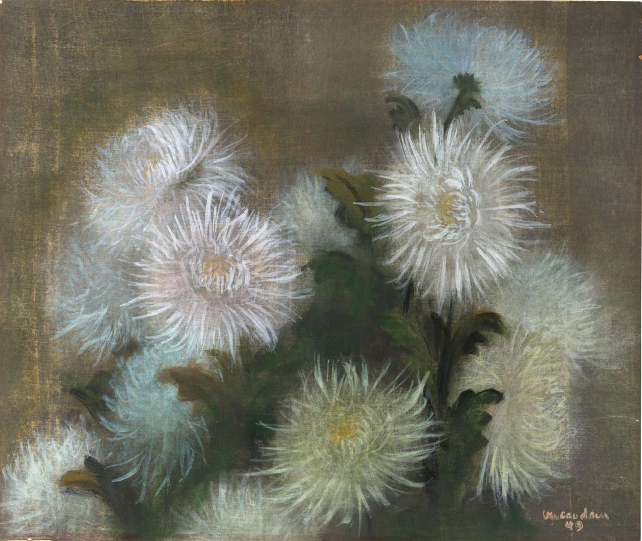 Tout comme Mai Trung Thứ qui, en dressant le portrait raffiné de Madame Nguyễn Nguyệt Nga a rendu hommage à la générosité du couple mécène, Vũ Cao Đàm offre à son tour une oeuvre riche en symboles. L’artiste, par des coups de pinceaux maîtrisés, dessine avec talent des pétales presque aériens, qui viennent s’ordonner parfaitement pour former les fleurs. L’utilisation des couleurs est tout autant maîtrisée puisque par des aplats de tons blancs, jaunes doux et bleus pastel, les boutons apparaissent. En arrière-plan, les tons verts et les nuances de bruns rehaussent le dessin des feuilles et des branches reprenant la technique du sfumato italien.