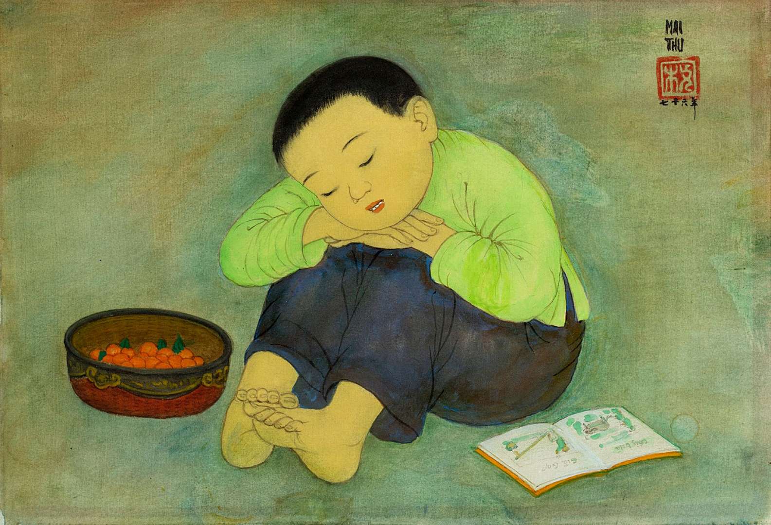 Quả quất (hay còn gọi là cam vàng) từ thời cổ đại đã là biểu tượng của sự thịnh vượng. Loại quả này thường được tặng làm quà vào dịp Tết Nguyên Đán. Sự tinh tế của chiếc giỏ ngụ ý đây là khoảnh khắc của bữa tiệc gia đình. Một cách đầy thú vị, họa sĩ đã thể hiện hình ảnh một cậu bé trông có vẻ như đã cố gắng chống lại cơn buồn ngủ trước khi ngủ gật. Bên cạnh cậu là một giỏ quất chỉ còn một nửa. Có thể thấy rằng loại trái cây đầy năng lượng này dường như không đủ để