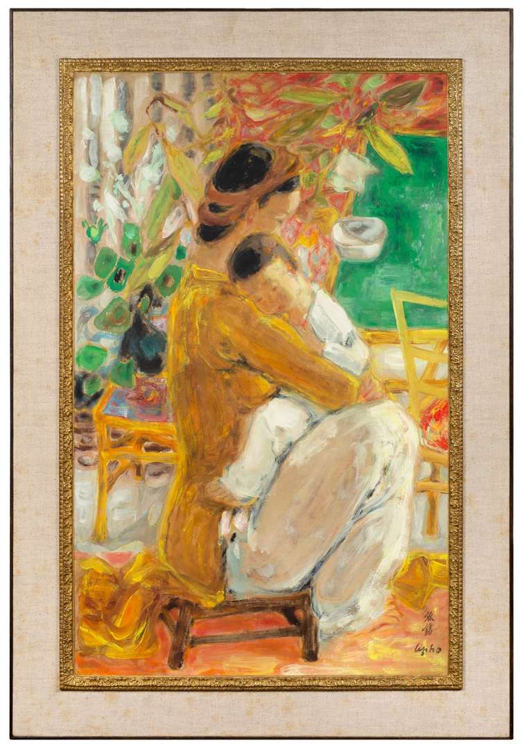 Le voyage en Europe effectué au début des années trente marque profondément l’œuvre de Lê Phổ, qui se nourrit tout au long de sa vie des arts du gothique international jusqu’aux modernismes du XXe siècle. L’artiste choisit ici de nous transporter dans l’intimité d’une mère qui enlace tendrement son enfant endormi, illustrant avec talent la description des peintres gothiques et de la Renaissance faite par Maurice Denis.