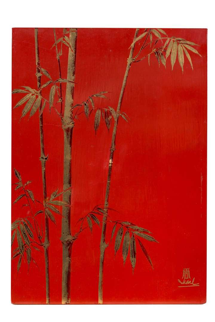 Lacquer with gold highlights on a red background, with a signature lower right
