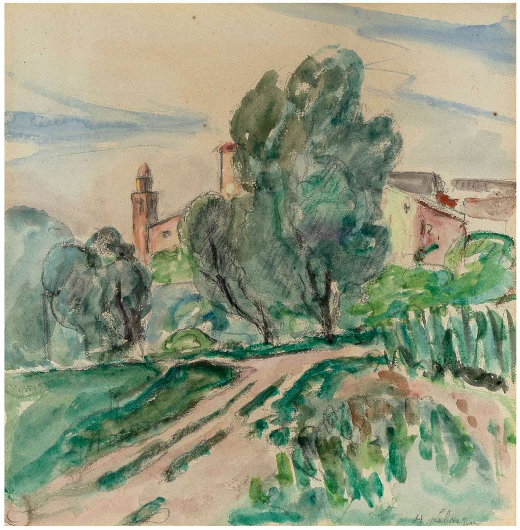 Paysage au clochet Aquarelle, gouache et fusain sur papier