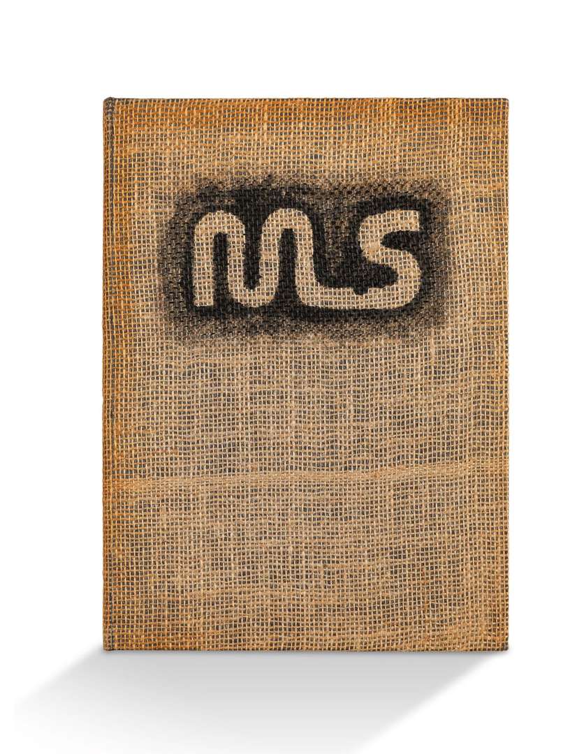Couverture garnie de toile agrémentée d'un motif au pochoir à l'encre noire et page de faux-titre ornée en carton ondulé
