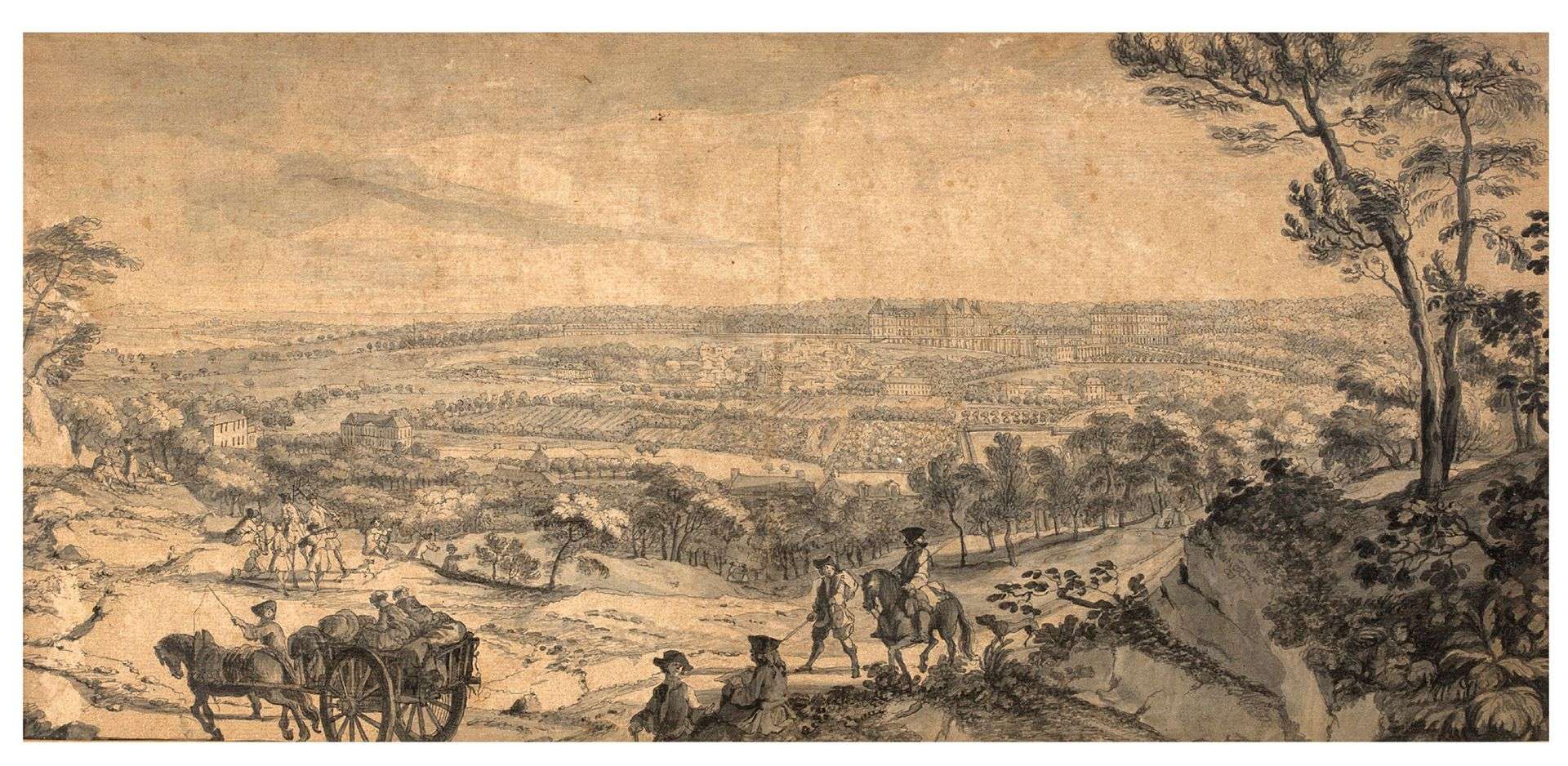 Ce dessin est à mettre en relation avec la gravure présentant la composition dans l'autre sens et conservée à Paris, au musée Carnavalet (inv. G 17273). Né non loin de Marseille, Jacques Rigaud est attesté graveur et marchand d'estampes en 1720 à Paris. Spécialisé dans les vues de Paris et alentours, il produit un grand nombre de dessins de vues de Paris, dessins qu'il grave presque systématiquement.