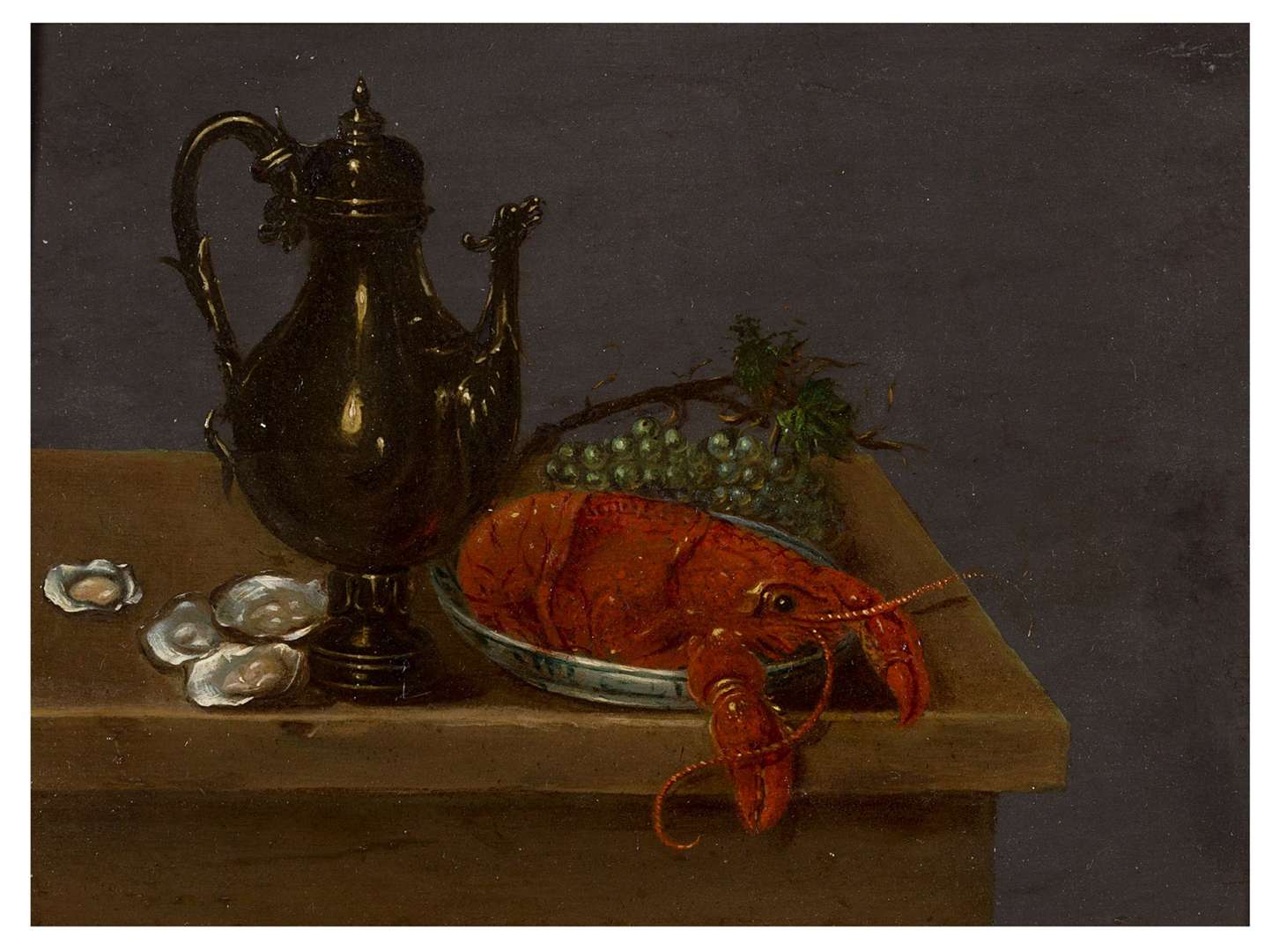 Nature morte aux huîtres, homard, grappe de raisin et dinanderie