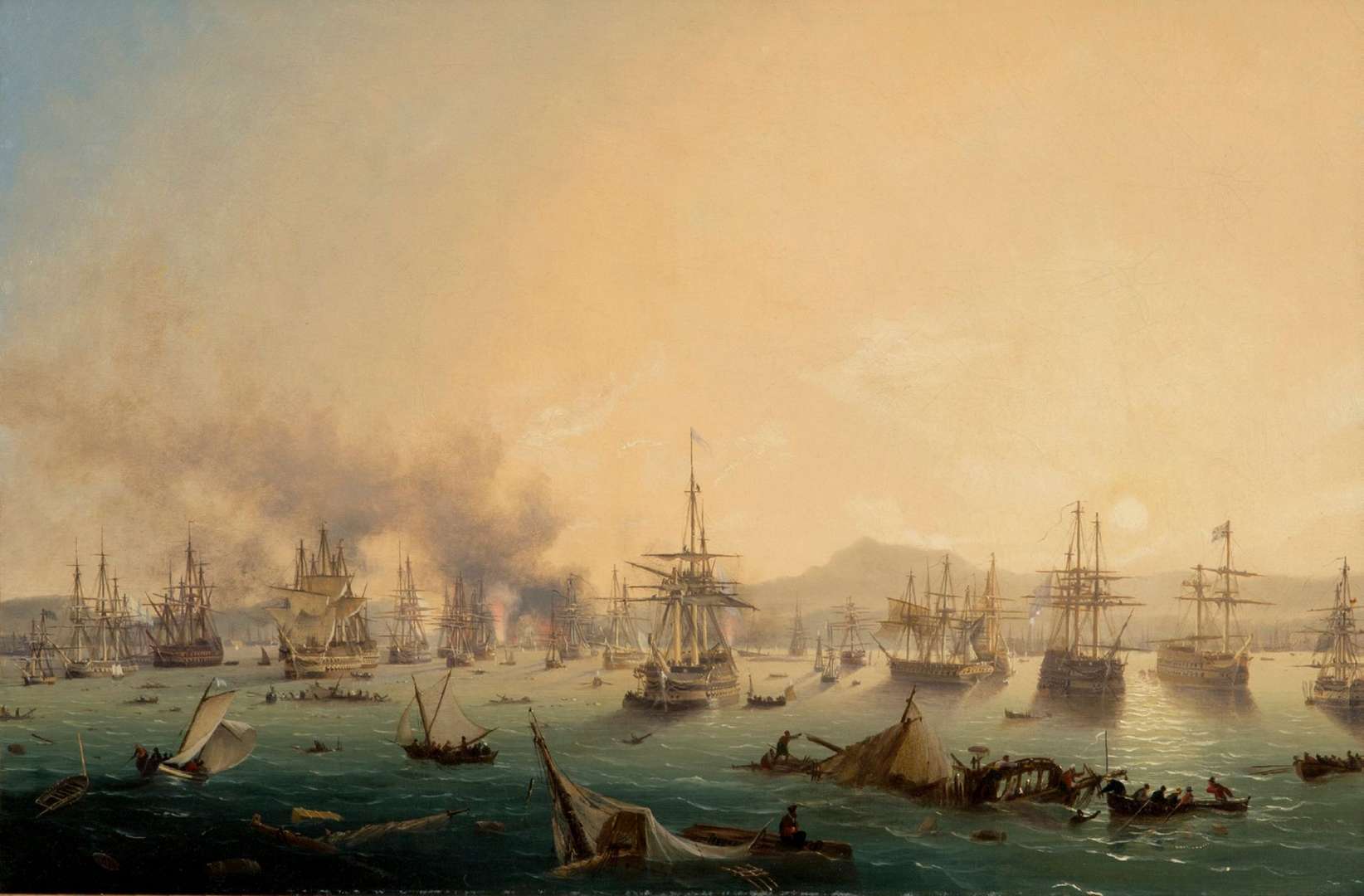 Le 20 octobre 1827, les forces navales anglaise, russe et française remportent à Navarin une importante victoire sur la flotte de l’Empire ottoman marquant ainsi un des points culminant de l’histoire de l’insurrection grecque ainsi que la première victoire française depuis la chute de Napoléon Ier. Débutée en 1821 par le soulèvement de la Grèce contre l’opposant turc, la guerre d’indépendance grecque émeut profondément l’opinion publique en Europe, poussant à l’ingérence les gouvernements occidentaux. La flotte de la triple alliance est alors constituée, commandée pour les Français par Henri de Rigny (1782 - 1835), pour les Russes par l’amiral Lodewijk van Heiden (1773 - 1850) et pour les Britanniques par Sir Edward Codrington (1770 - 1851). La flotte turco-égyptienne est détruite en l’espace de quatre heures par la coalition anglo-franco-russe : en fin d’après-midi, la bataille est terminée. La Grèce obtient par la suite progressivement son indépendance, confirmée par le traité d’Andrinople en 1829 et d’autres principautés des Balkans sous domination turque deviennent autonomes. La bataille de Navarin est aujourd’hui considérée comme la dernière grande bataille navale de la marine à voile, avant l’avènement des navires à vapeur, des cuirassés et des obus.