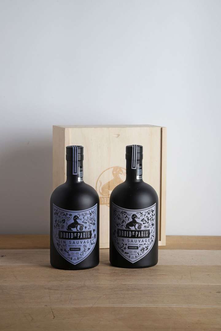 2 B GIN SAUVAGE MANUBII DRUID OF PARIS 50 cl 45% (Caisse Bois d'origine) - NM - Stéphane Meyer