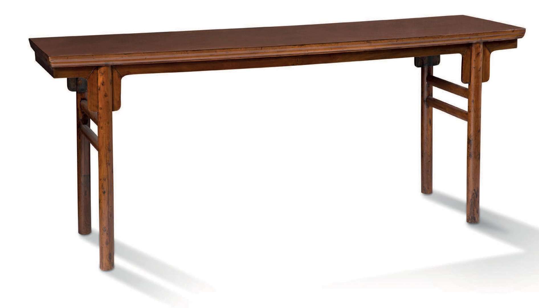 Table pingtou'an en bois naturel, possiblement du huanghuali, un long plateau rectangulaire reposant sur quatre jambes cylindriques, la ceinture droite, deux barres latérales formant traverses sur les petits côtés.