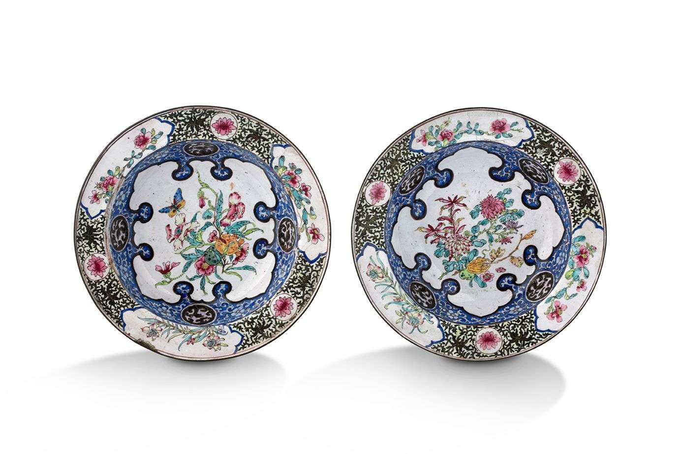 En émail peint sur cuivre décorés aux émaux polychromes de réserves alternées de rinceaux et tiges fleuries. Le centre de l'un avec des chrysanthèmes et citrons digités, l'autre des pivoines et grenades.