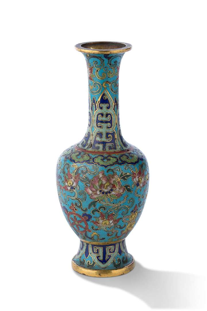 = Petit vase bouteille en bronze doré et émaux cloisonnés décoré des Baijixiang (« Huit Emblèmes Bouddhiques ») alternant avec des rinceaux de lotus épanouis sur un fond bleu turquoise, le pied et le col orné de motifs de cigales stylisées, l'épaule soulignée par une frise de têtes de ruyi.