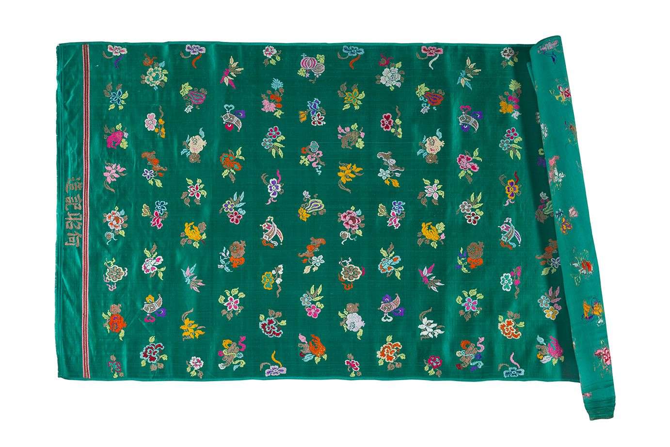 De soie verte à décor brodé aux fils de soie polychromes et fils d'or d'un semis de motifs auspicieux parmi lesquels les «Ba Bao» et les «San Duo». Avec une marque d'atelier brodée «He Chao Ji Zao».