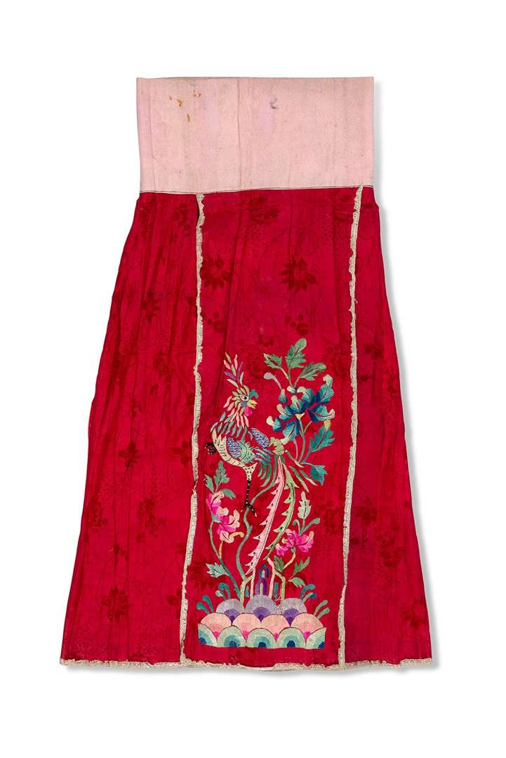 En damas rouge à fond décoré de fleurs et rinceaux. Les panneaux principaux brodés aux fils de soie polychromes, de phénix parmi les fleurs.