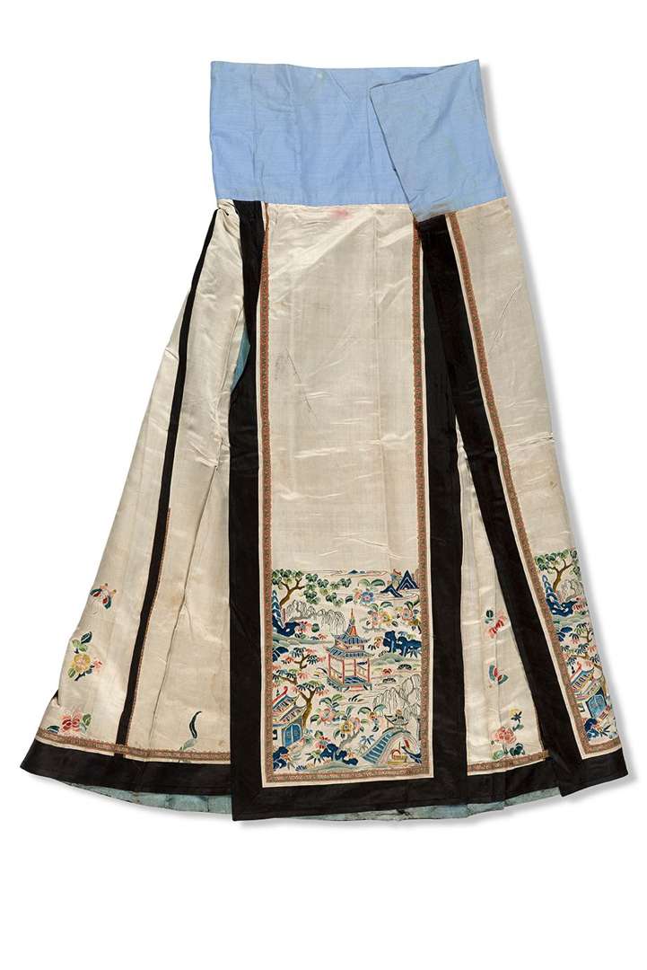 En satin de soie crème à décor brodé aux fils polychromes de pavillons dans un paysage et tiges fleuries. Doublée de soie bleu ciel.