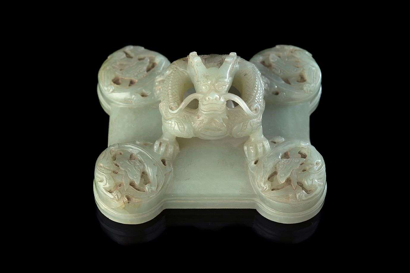 Rare couvercle de brûle-parfum tulu en jade néphrite céladon, de forme rectangulaire aux angles flanqués de quatre médaillons décorés de figures de chilong. La prise formée par un puissant dragon impérial au corps noueux reposant sur ses quatre pattes.
