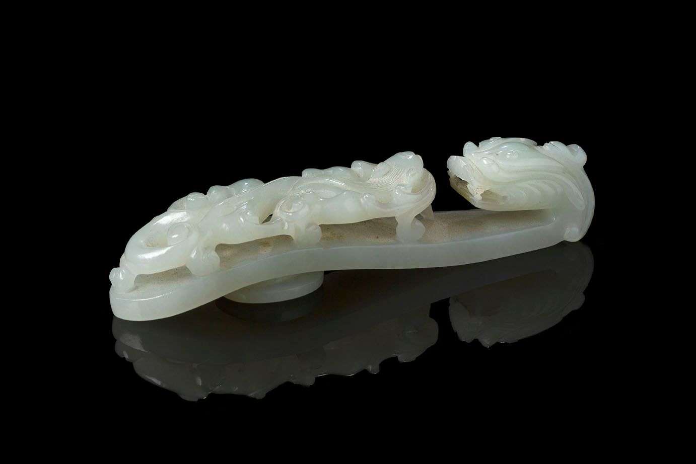 En jade céladon pâle sculpté à tête de dragon et chilong rampant.