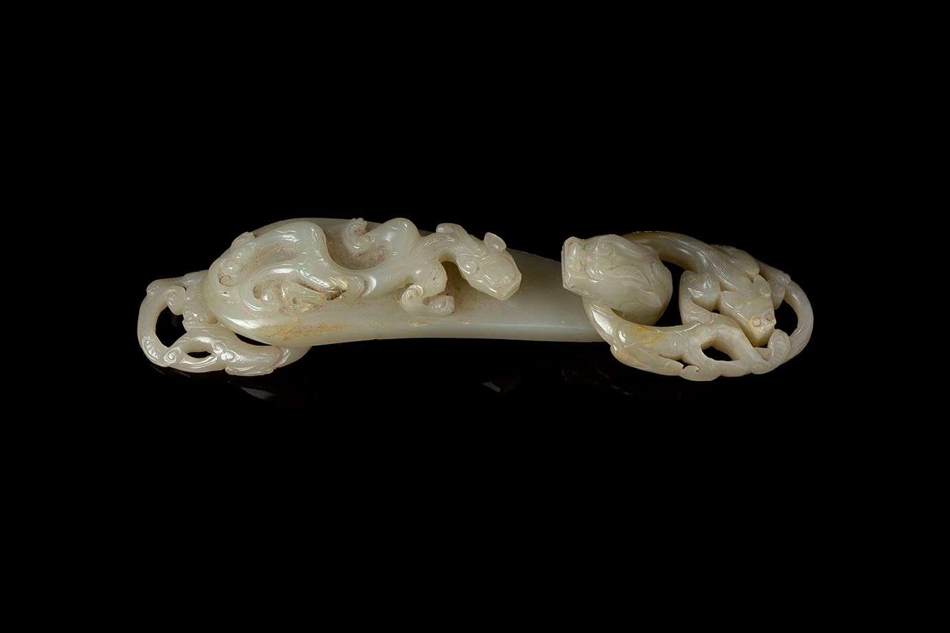 Tripartite en jade céladon sculpté ajouré de chilong rampants.