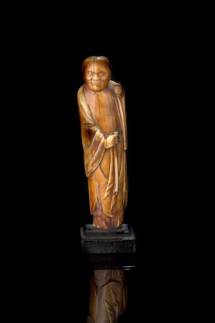 ~ Petite statuette en ivoire sculpté représentant un arhat vêtu d'une longue robe. L'ivoire avec une belle patine miellée. Avec son socle en bois naturel.