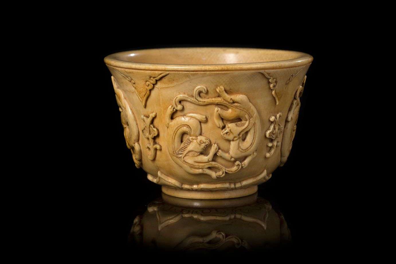 En ivoire sculpté à décor de chilong formant des médaillons alternés avec des tiges de champignons lingzhi. La base avec deux marques en caractères sigillaires dans des cartouches.