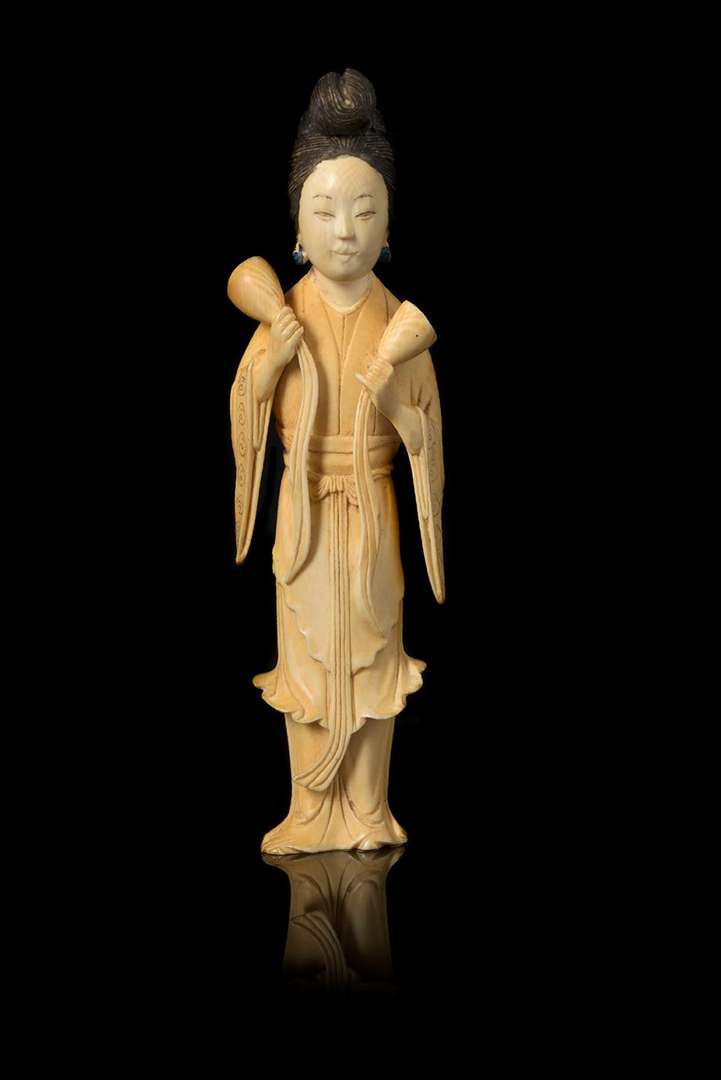 En ivoire sculpté rehaussé de laque colorée figurant une immortelle debout tenant dans chaque main des tiges de lotus.