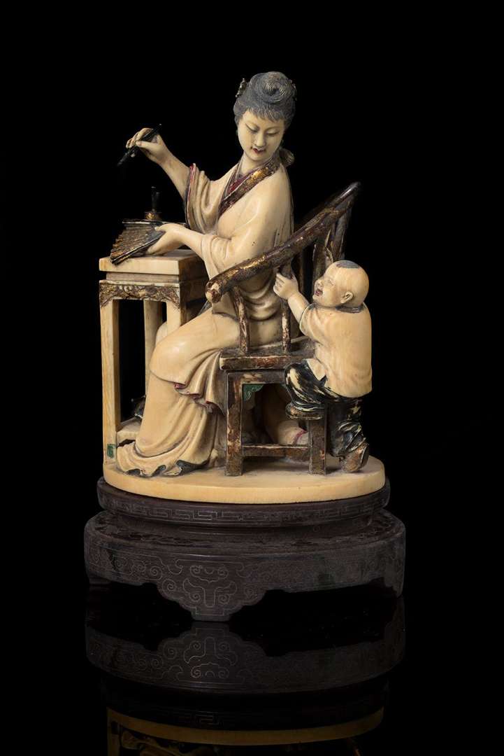 En ivoire sculpté rehaussé de laque polychrome représentant une beauté assise calligraphiant un éventail, accompagnée de deux enfants rieurs. Avec son socle en bois naturel et filets incrustés.
