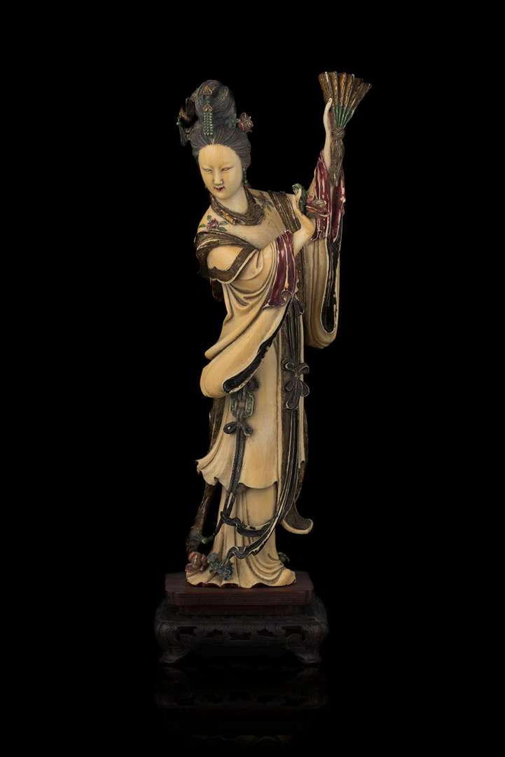 En ivoire sculpté rehaussé de laque polychrome figurant une immortelle tenant un éventail et une rose dans les mains.