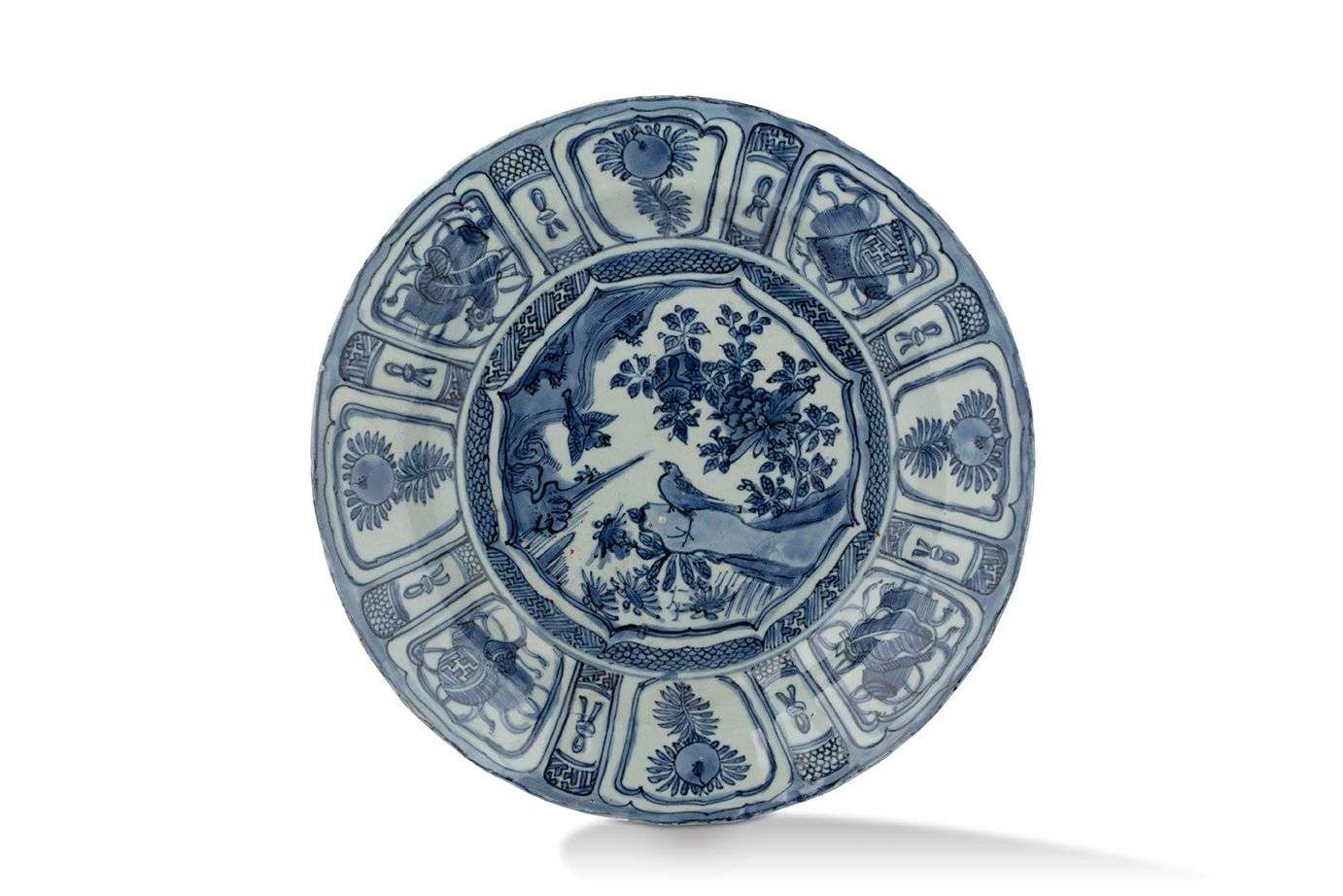 Plat en porcelaine bleu-blanc de type « kraak », décoré au centre de deux oiseaux parmi les fleurs et les rochers dans un médaillon polylobé, le marli orné de pêches de longévité et objets précieux dans des cartouches alternés.