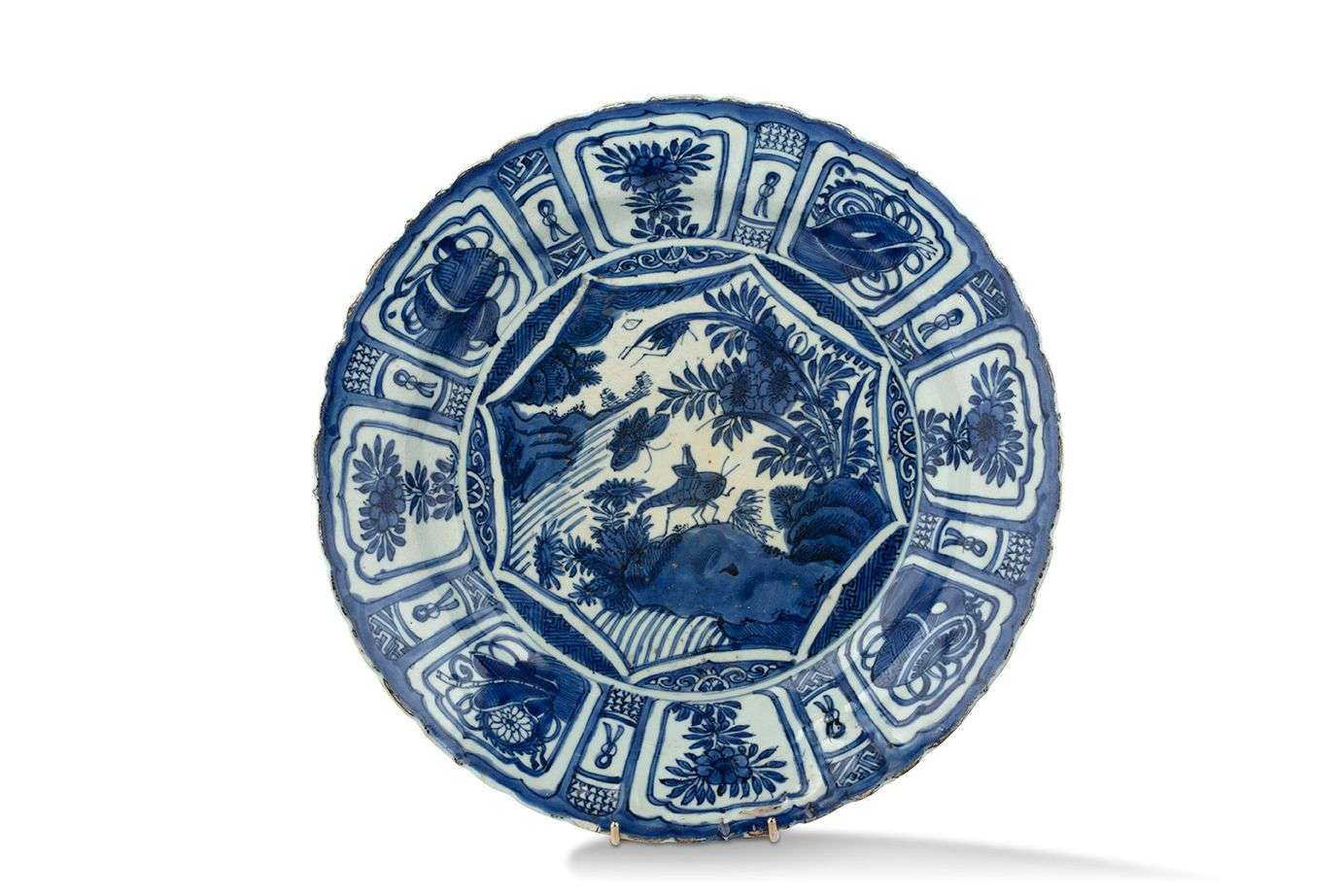 Plat en porcelaine bleu-blanc de type « kraak », décoré au centre de sauterelles et papillon parmi les fleurs et les rochers dans un médaillon polylobé, le marli orné de pêches de longévité et objets précieux dans des cartouches alternés.