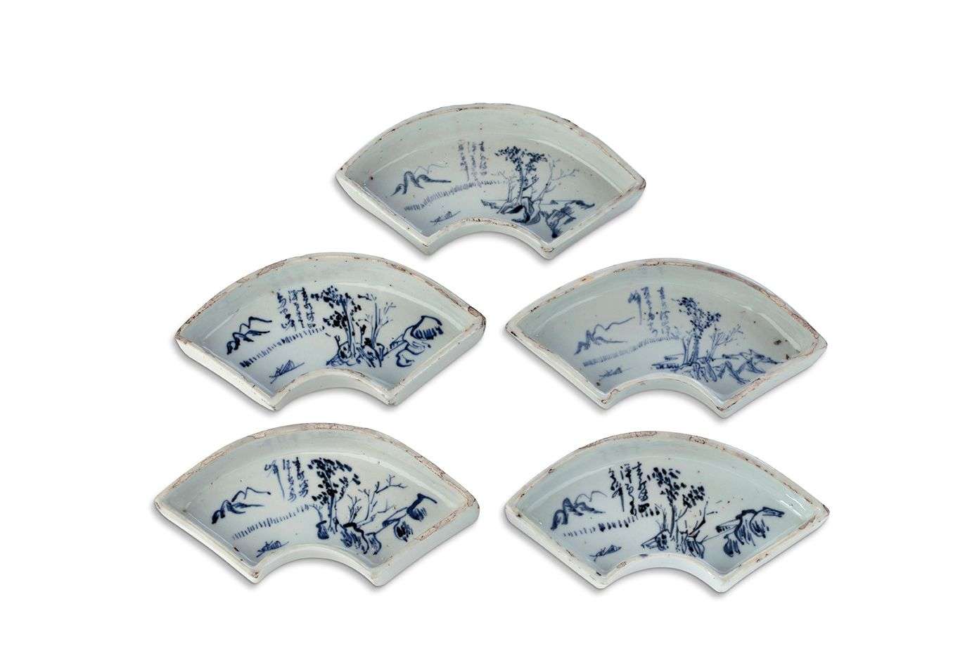 En porcelaine bleu-blanc dits «ko-sometsuke» imitant la forme d'éventails à décor d'un paysage lacustre sur fond de montagne accompagné d'un court poème.