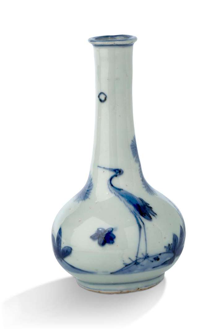 En porcelaine bleu-blanc de type «ko-sometsuke» à décor d'une grue et d'un pin.