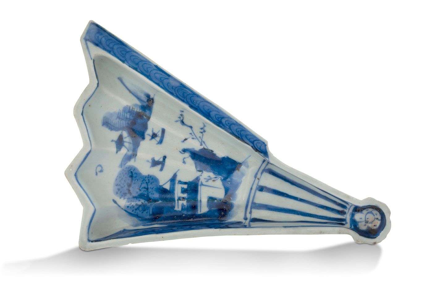 En porcelaine bleu-blanc de type «ko-sometsuke» en imitant un éventail replié et à décor d'un paysage lacustre.
