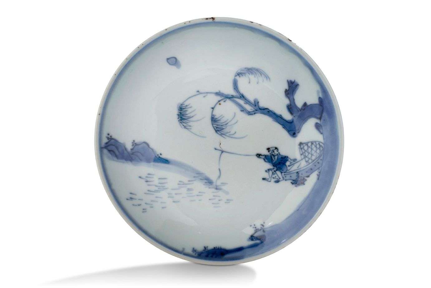 En porcelaine bleu-blanc dits «ko-sometsuke» à décor d'un personnage pêchant sous un saule dans un paysage lacustre. La base avec une marque «Ya» dans un cercle en bleu sous couverte.