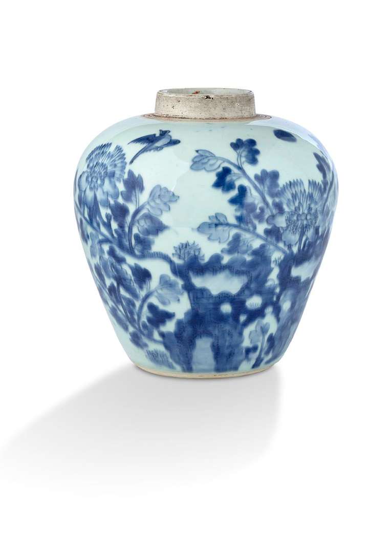 En porcelaine bleu-blanc décoré d'oiseaux parmi les pivoines et les rochers.