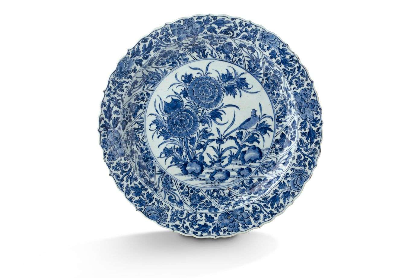 En porcelaine bleu-blanc à décor de chrysanthèmes et oiseaux, l'aile ornée de motifs tournoyants de fleurs variées et rinceaux. La base avec une marque à la pierre sonore dans un double-cercle en bleu sous couverte.