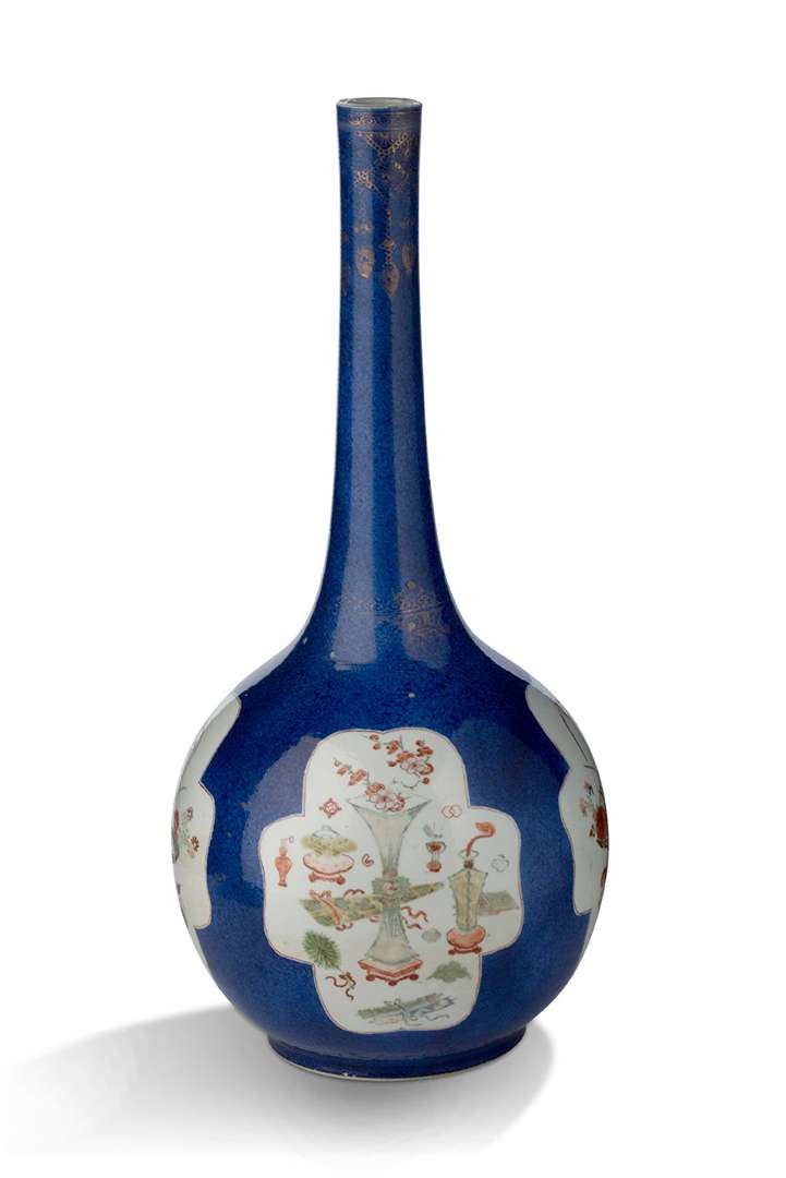 En porcelaine à fond bleu poudré et rehauts d'or, orné de réserves quadrilobées avec des paniers fleuris et «Cent Antiques» aux émaux de la famille verte.