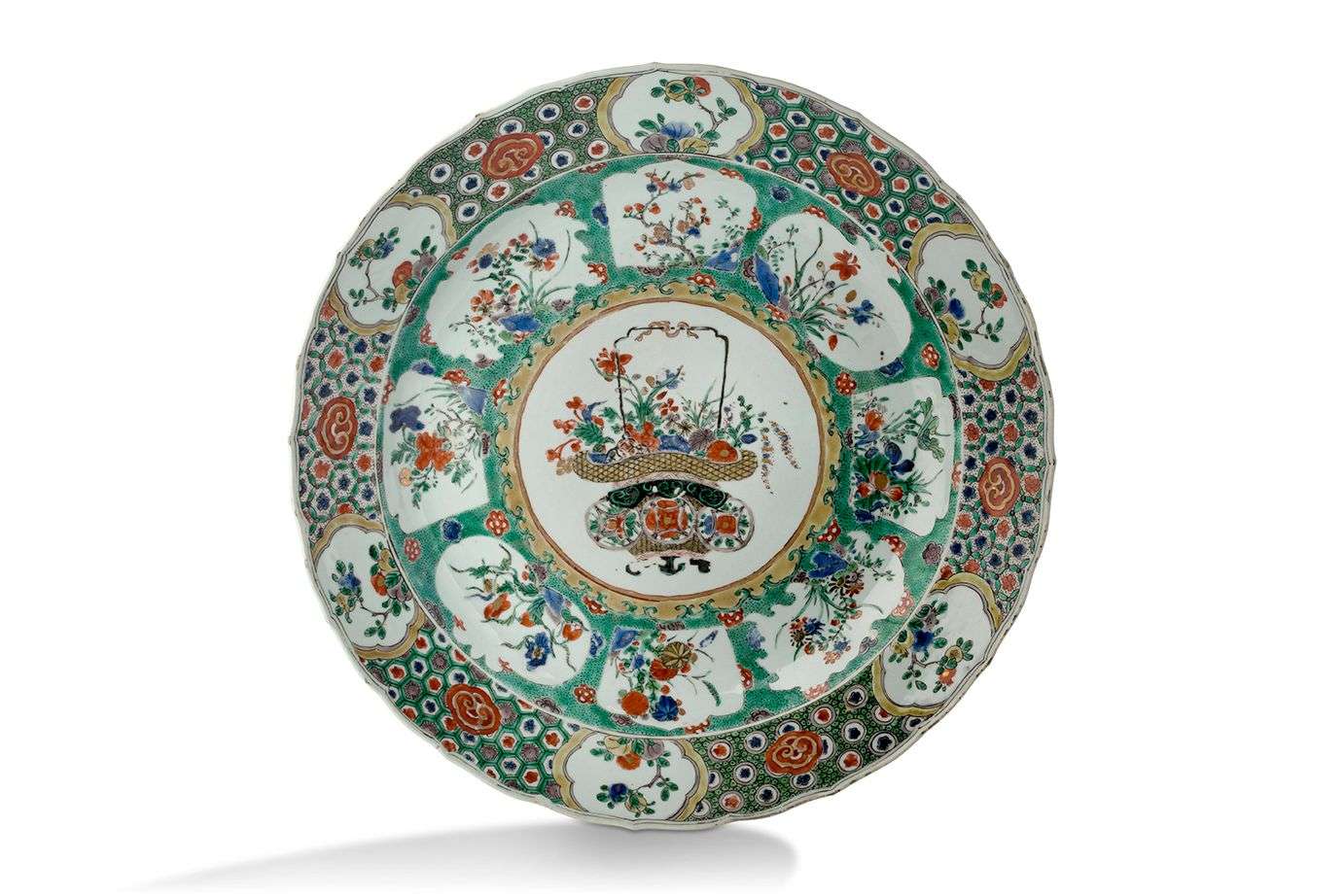 En porcelaine aux émaux de la famille verte et rehauts d'or à décor de paniers garnis de fleurs et frises concentriques de réserves peuplées d'essences variées.