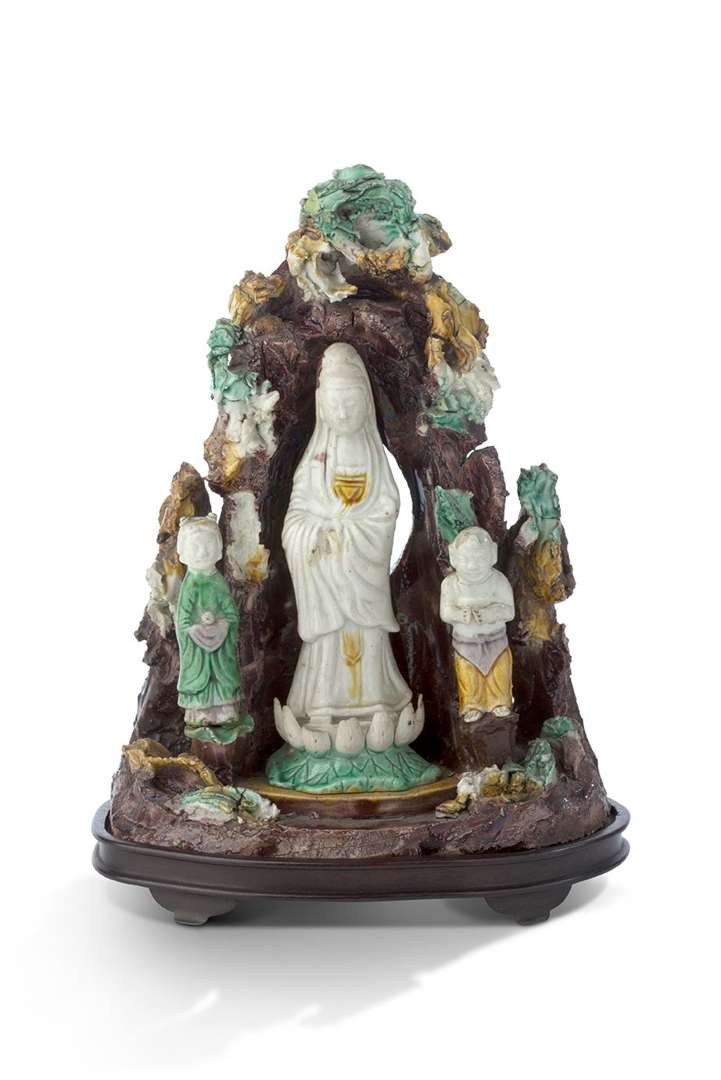 Représentant la bodhisattva Guanyin debout sur un lotus abritée sous une grotte, accompagnée de deux adorants.