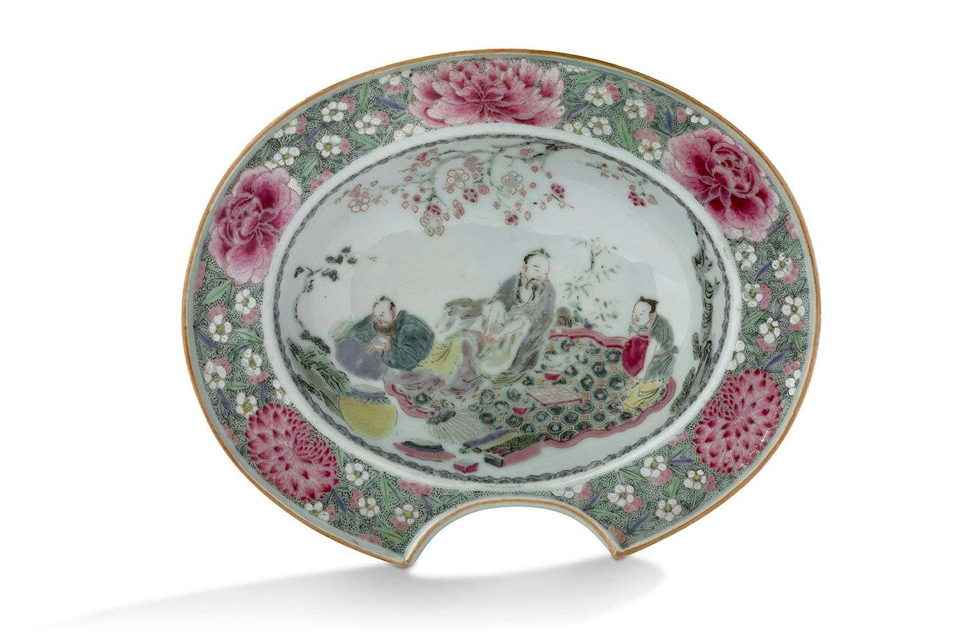 En porcelaine aux émaux de la famille rose décoré de deux lettrés et leur attendant dans un jardin, entouré des «Trois Amis de l'Hiver».