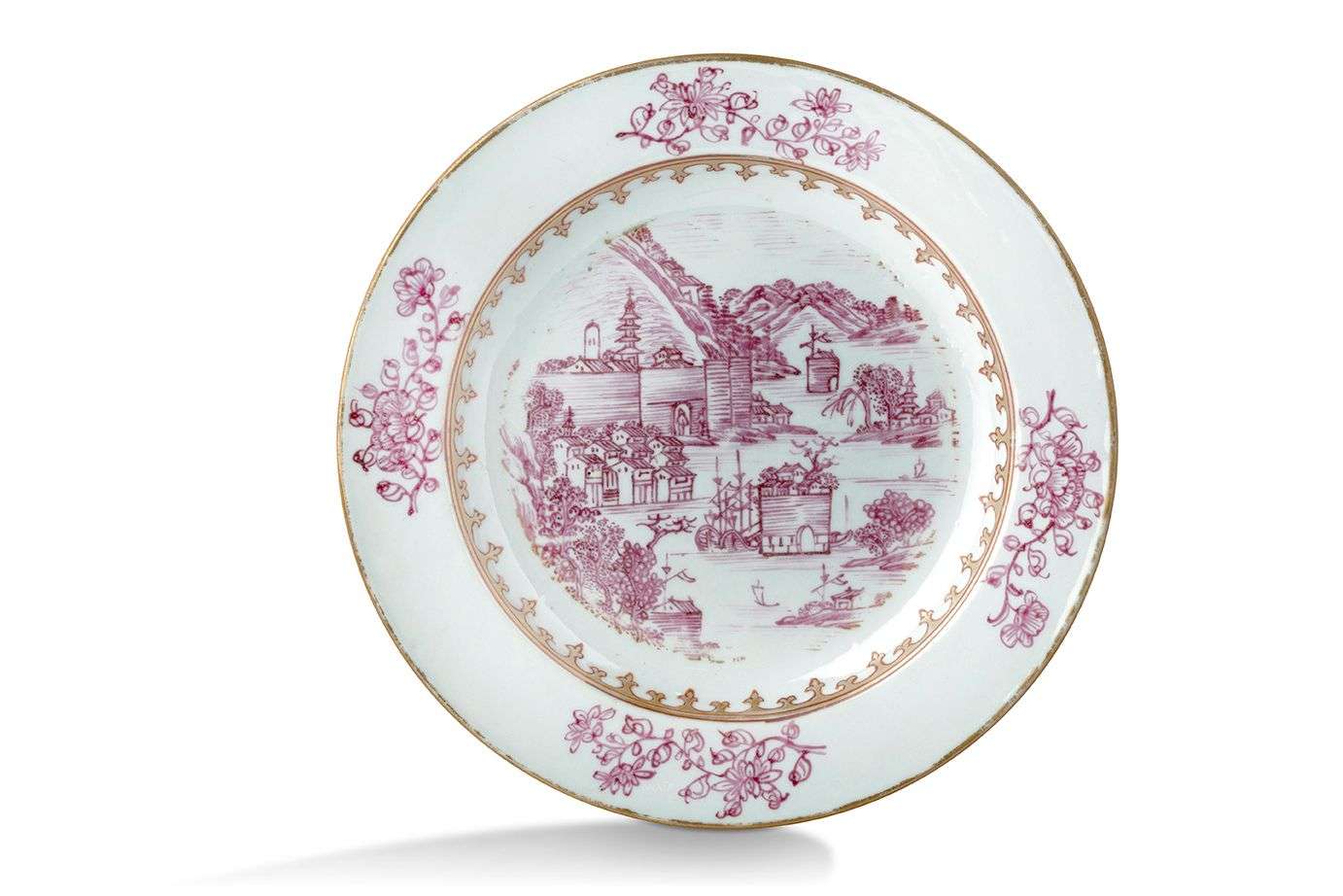 En porcelaine émaillée carmin et rehauts d'or décorée d'une vue du port de Canton.