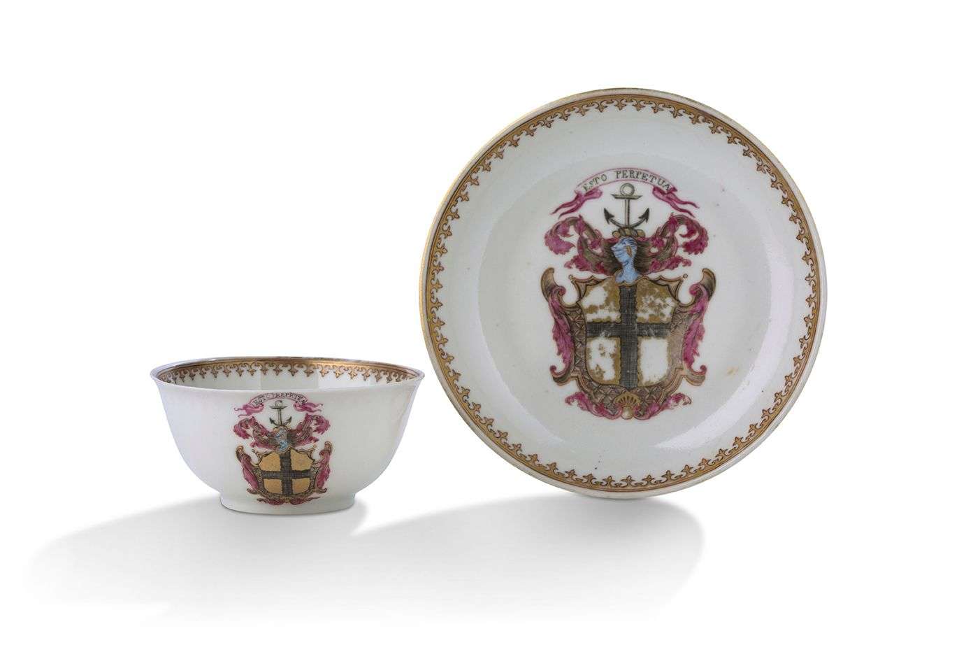 En porcelaine aux émaux de la famille rose et rehauts d'or décoré au centre du blason et de la devise «Esto Perpetua» de la famille Rait. La lèvre soulignée par une frise de fers de lance.