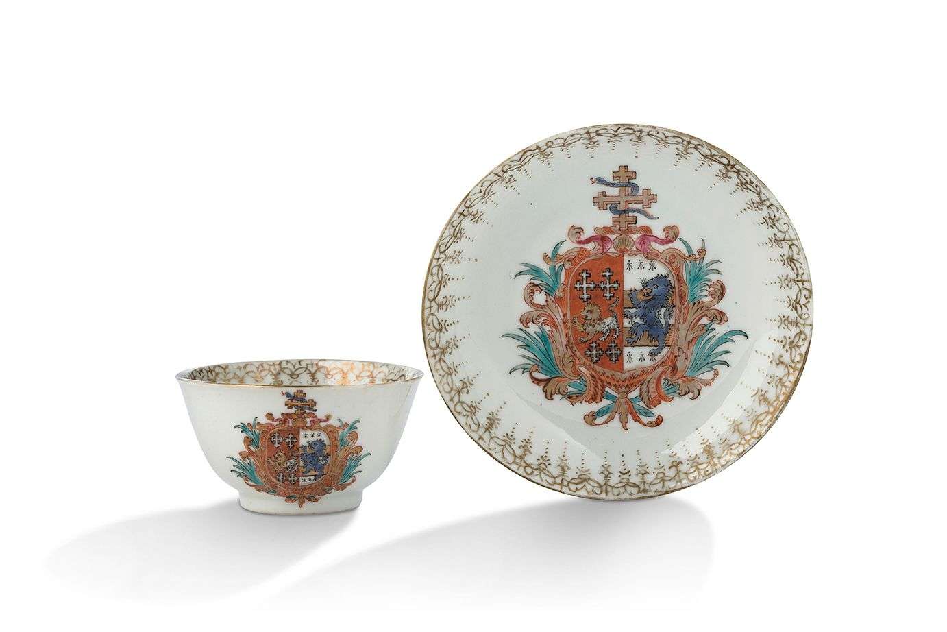 En porcelaine aux émaux polychromes à décor armorié, avec un imposant blason entouré de lambrequins et palmes, surmonté d'une croix recroisetée où s'enroule un serpent.