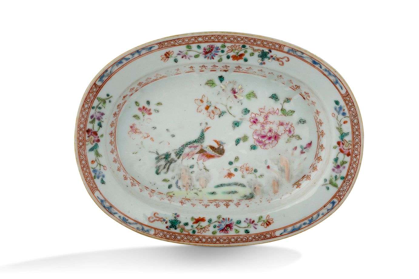 En porcelaine aux émaux de la famille rose à décor d'un couple de paons dans un jardin fleuri de pivoines et fleurs variées.