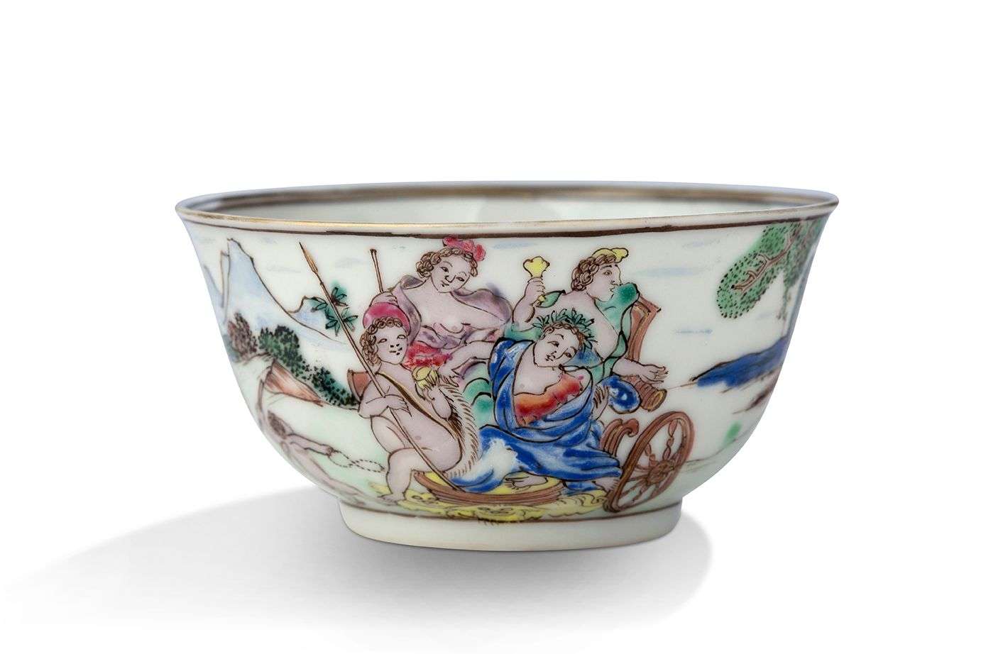 En porcelaine aux émaux de la famille rose à décor d'une scène mythologique d'après «La Terre» d'Albani (1578 - 1660).