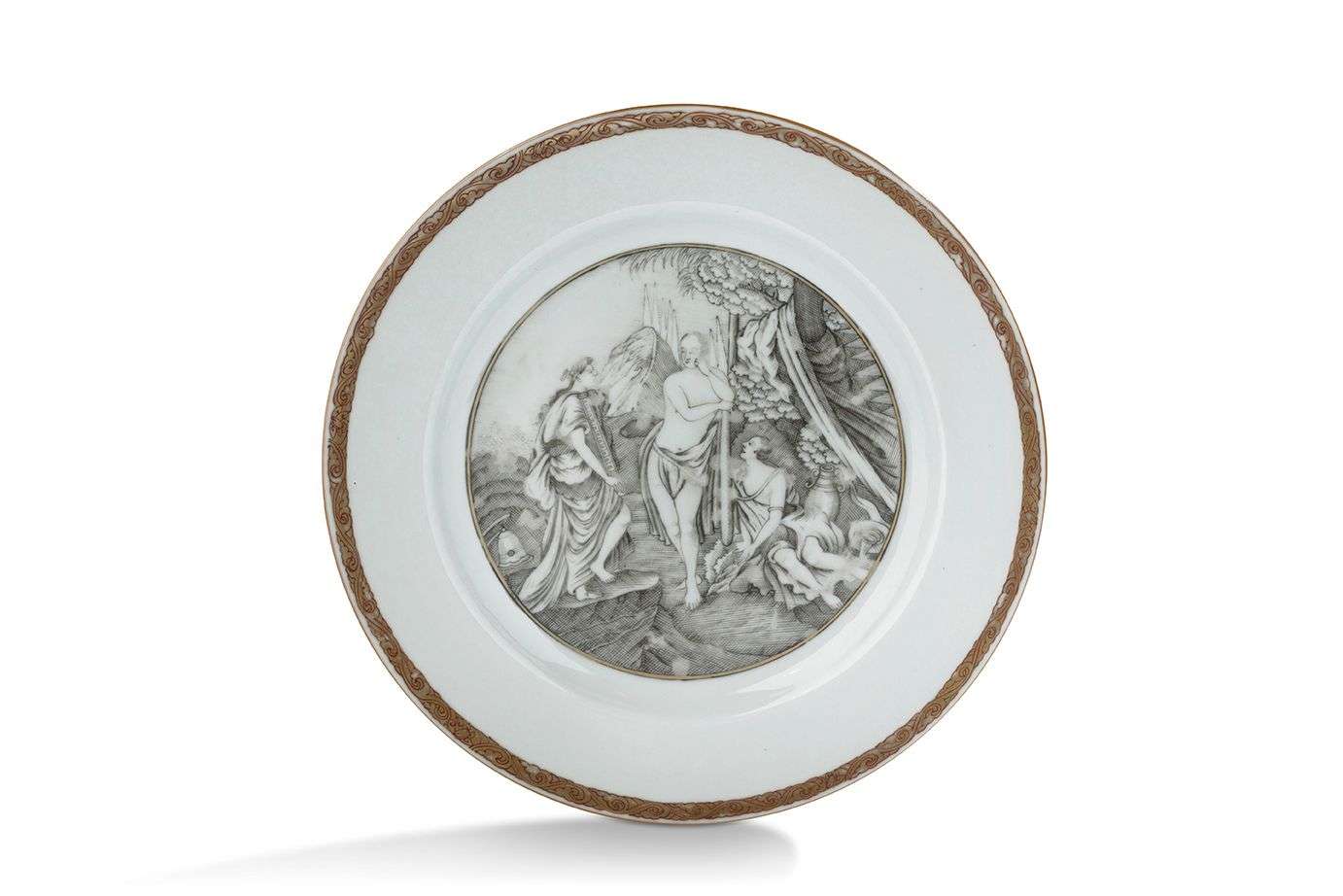 En porcelaine à décor en grisaille et rehauts d'or représentant le «Choix d'Hercule» d'après une estampe gravée en 1713 par Simon Gribelin II. Le héros représenté au centre entre la Vertu et la Volupté, le bord du marli avec une frise de denses rinceaux.