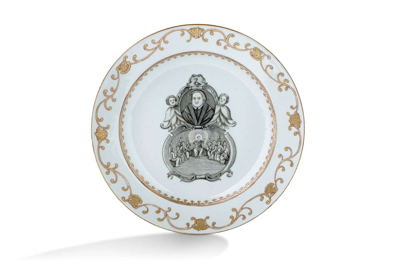 En porcelaine à décor en grisaille et rehauts d'or figurant le portrait de Martin Luther dans un cartouche encadré par deux anges, ainsi qu'un second cartouche avec le Christ et ses disciples. L'aile ornée d'une frise de fers de lance et d'un rinceau ponctué de coquilles.